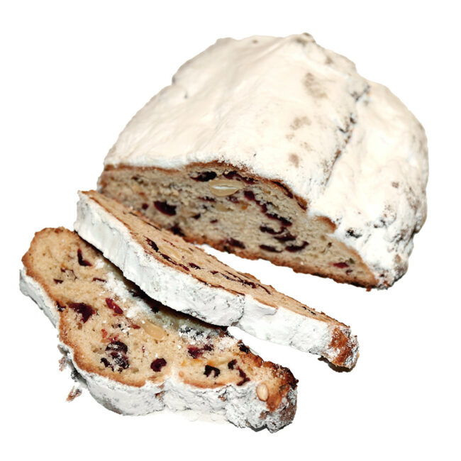 Weizenmehl, Butter, Cranberry, Milch, Cashewkerne, Mandeln, Orangeat, Zitronat, Zucker, Rum, Hefe, Bittermandelaroma, Salz