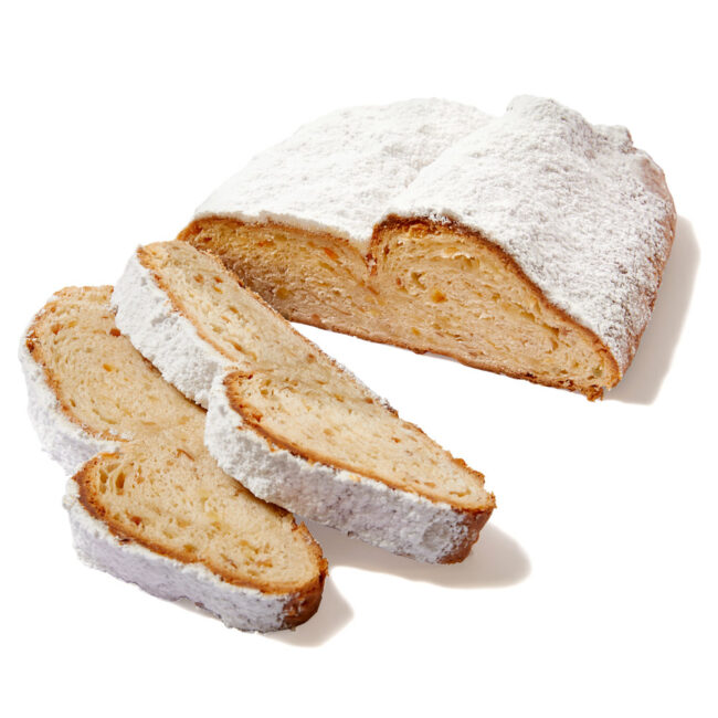 Weizenmehl, Butter, Milch, Mandeln, Orangeat, Zitronat, Zucker, Rum, Hefe, Bittermandelaroma, Salz